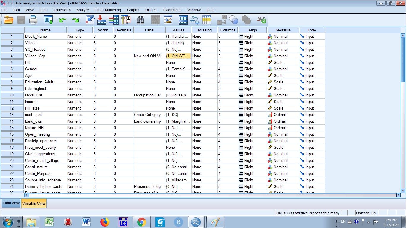 Further, you would like to see the categories in variables in your result. For this, lables can be defined. For example, recall the gender variable. You might want the labels for its two categories e.g. male and female. Values are the critical columns and coding them can directly impact your results. Male and Female can both have 1 or 2 as coding values but it should be decided on the basis of your hypothesis. For example, if one wants to test the hypothesis males are more educated than females.If your data set has education levels coded on higher side (graduate=3,… below primary=1), make sure, you assign values 2 for males and 1 for females for a society with a low level female literacy rate.